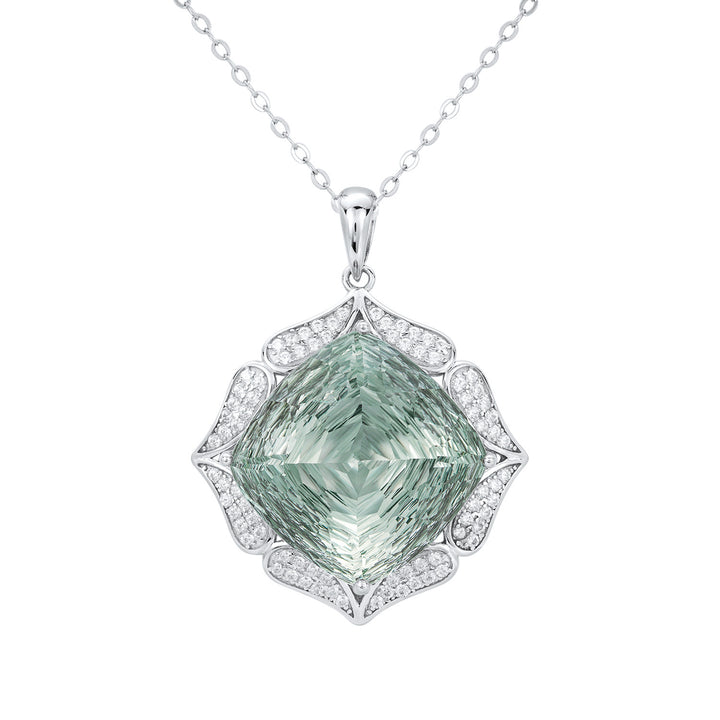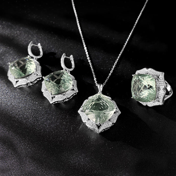 This luxury sweater chain set combines S925 sterling silver with a large natural green crystal, crafted into a geometric pendant that harmonizes modern elegance with spiritual energy. The 22-carat natural green crystal emits earthy frequencies, while the silver enhances conductivity and protection, creating high-grade jewelry for both style and energetic alignment.