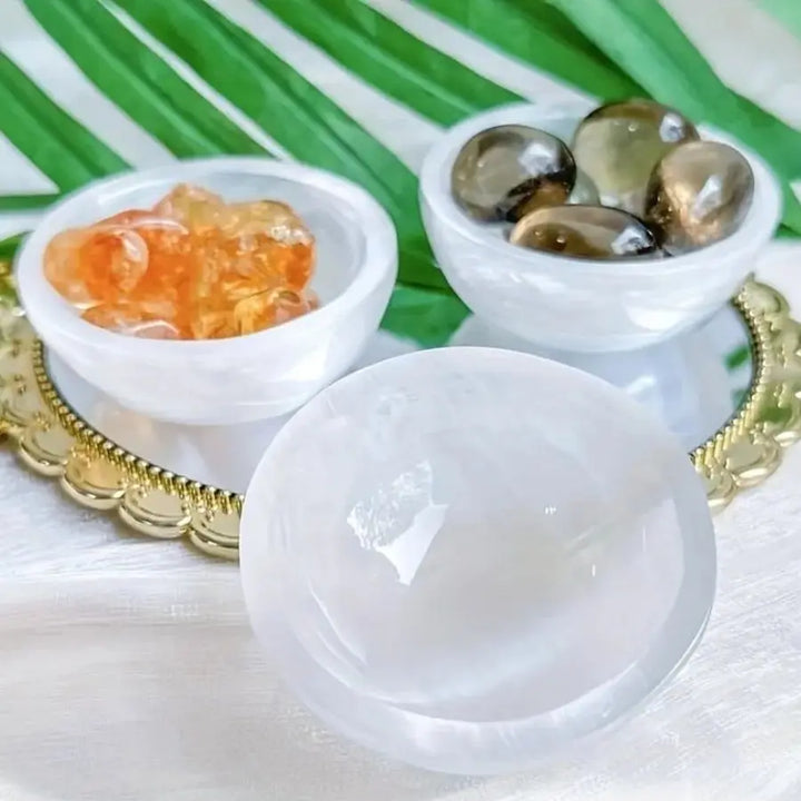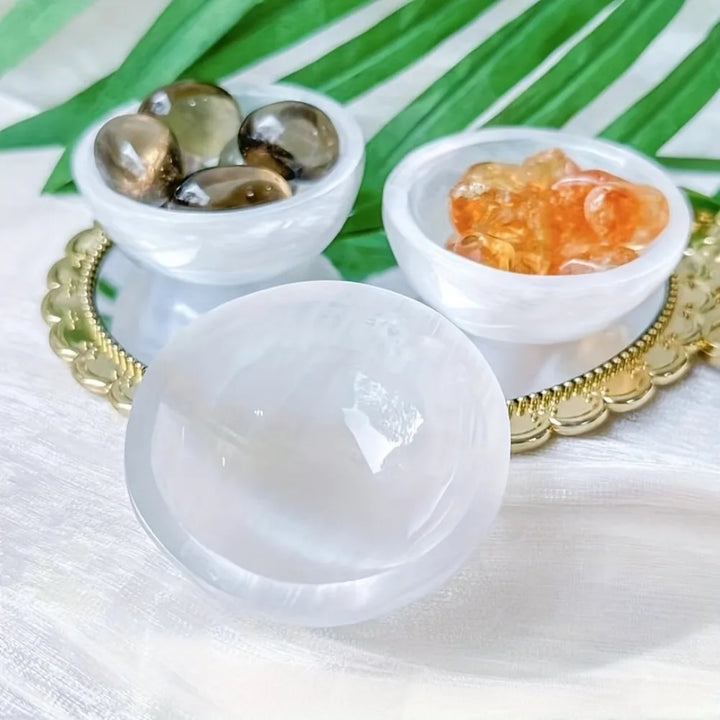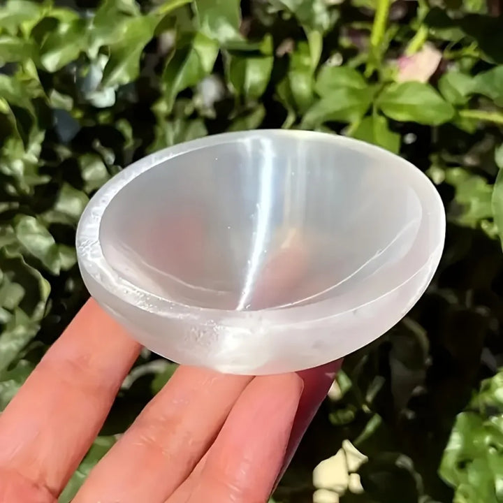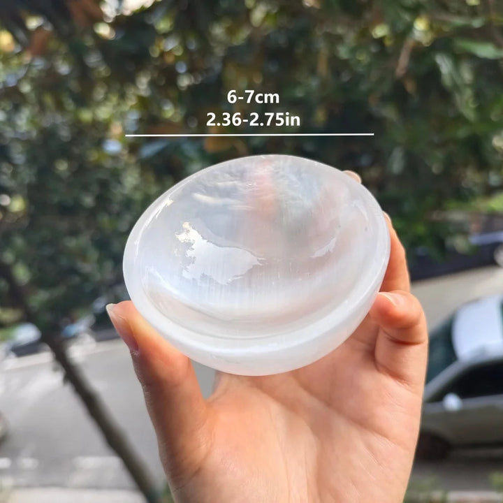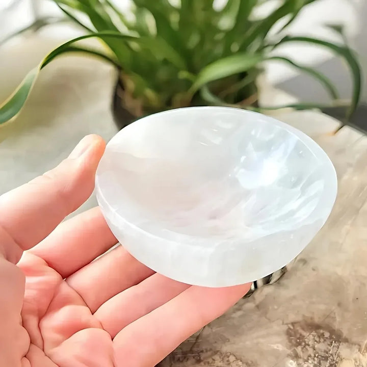 This exquisite natural selenite bowl, crafted from a single piece of high-vibrational crystal, serves as a powerful energy cleansing tool and elegant spiritual decor. With its smooth polished surface and gentle milky-white glow, this 7-8cm diameter bowl purifies spaces, charges other crystals, and creates a sacred atmosphere for meditation or energy work.