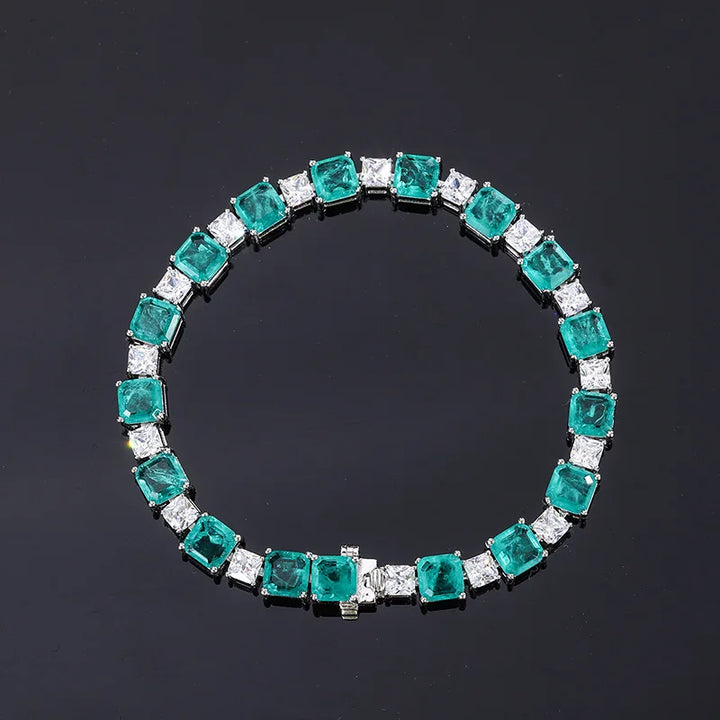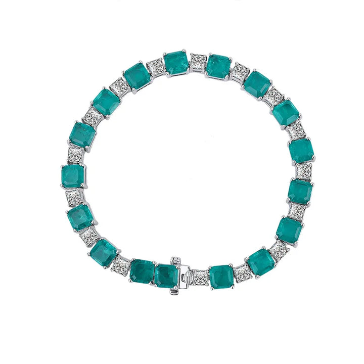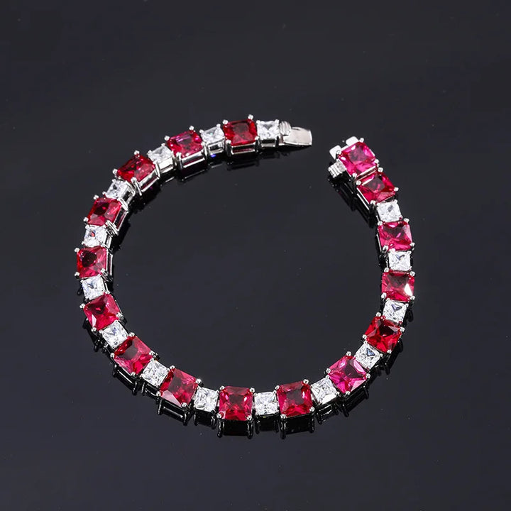 This exquisite S925 sterling silver bracelet features an elegant alternation of 6x6mm emerald and ruby crystals with clear quartz accents, creating a harmonious balance of passion and prosperity energies. Each geometrically cut stone is meticulously set in sterling silver, offering both timeless elegance and powerful metaphysical properties for the modern spiritual woman.